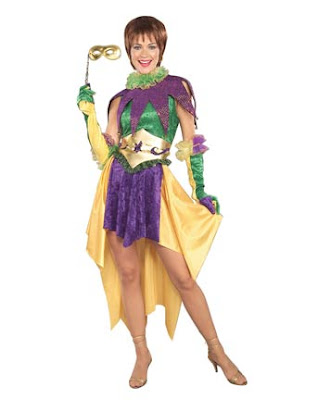 The costume comes with a ruff le trimmed collar, gloves, and a wide belt. It doesn't come with a mask though, but this store sells several of them. My favorites are the Gold Wand Feather Mask ($7.99), Feather Mask ($7.99), and Purple Wand Feather Mask ($7.99). To make this costume stand out even more, you could buy the Sexy Mardi Gras Strappy Sandals ($49.99), which features a gold platform & heel, purple toe straps, and a green heel & ankle. They're also adorned with dangling beads and chains, sequin, and feathers.